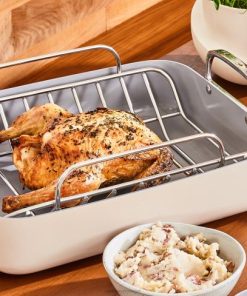 A cozinha limpa é preparada com a assadeira – ideal para tudo, desde receitas de eventos principais até assados no jantar de domingo. apresentando nosso revestimento antiaderente exclusivo, esta panela torna o cozimento e a limpeza mais fáceis do que nunca. grelha de aço inoxidável incluída.